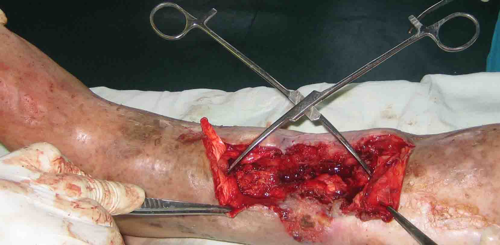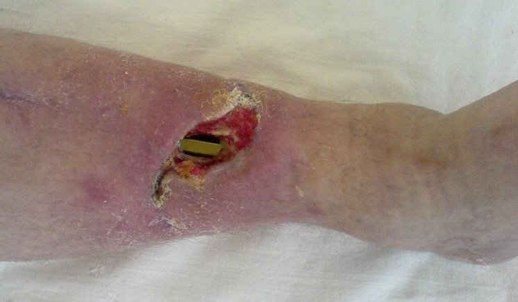 Итак, в настоящий момент больной пришел к нам с полной нагрузкой на оперированную конечность и с такой картиной (см. приложение). Участок мягких тканей с передней стенкой нижней трети ББК, выгнил и представляет дефект 2×2,5 см. На перевязке - циркулярный(?) некроз костной трубки.