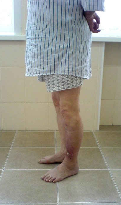 Кратко: мужчина за 60 лет получил травму 28 лет назад (переехало автобусом). Оперировался десятки раз, в итоге с очередным патологическим переломом, хронической язвой и гипсовой лонгетой попал ко мне... Объективно - остеомиелит, инфицированный ложный сустав (или как его назвать), флегмона по наружной поверхности