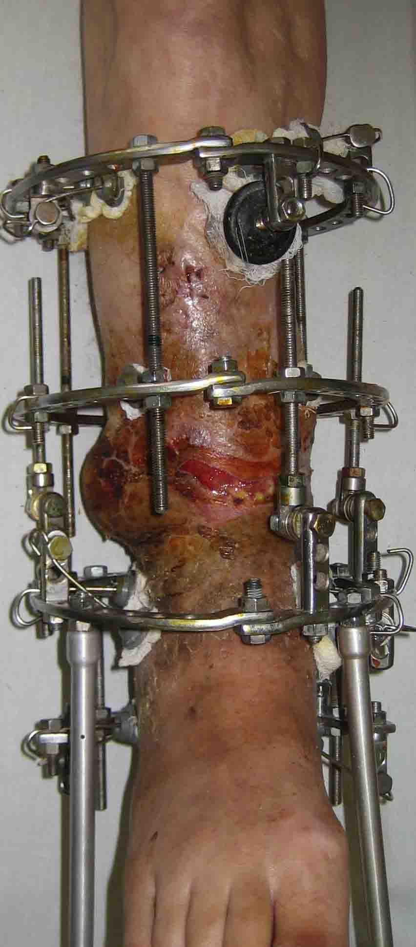 На операции резекция 8 см, внешний остеосинтез,одновременное сближение примерно на 4 см, а затем постепенное сближение до полного контакта в течение 3 недель. Рана с патологически измененными краями, имевшая на операции размеры примерно 4-5 на 10-12 см закрылась самостоятельно в течение примерно 2-х мес. Ну не самостоятельно, конечно, а с нашей помощью, но без пластики.