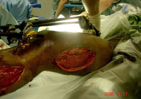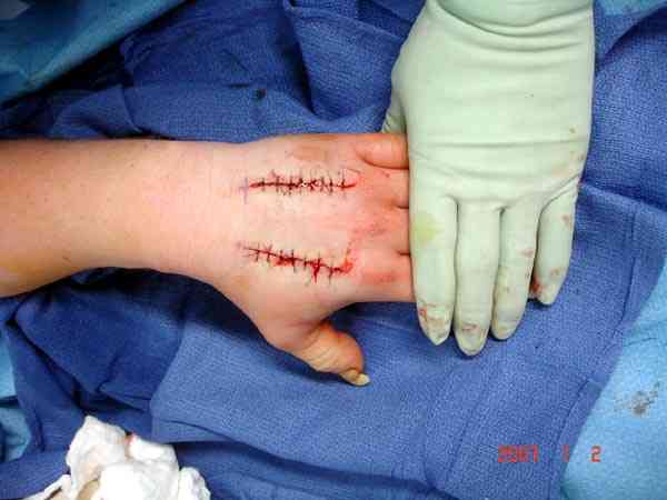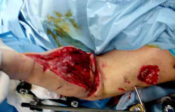 Предпочтительно сначала закрыть медиальную сторонну, а затем латеральную, потому что при невозможности закрытия кожных ран, наружную сторону легко закрыть кожной пластикой.