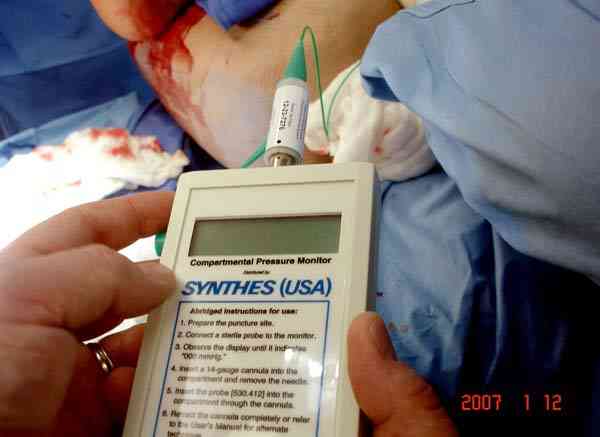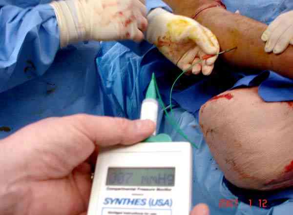 После доказательства и тщательной документации неблагоприятных проявлений, в операционной проводится фасциотомия. Желательно проводить вскрытия только заинтересованных компартментов, потому что наличие высокого давления с одной стороны не доказывает вовлечения в процесс другой стороны.
