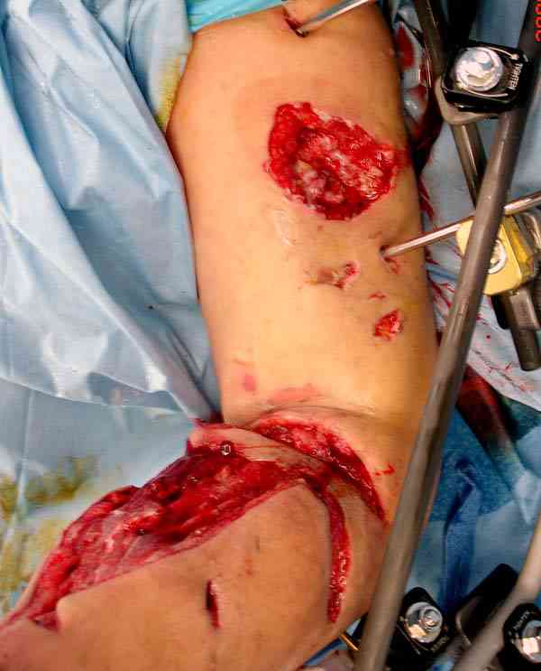 Оптимальный остесинтез внеочаговая фиксация, учитывая фасциотомный разрезы - стержневой аппарат.
